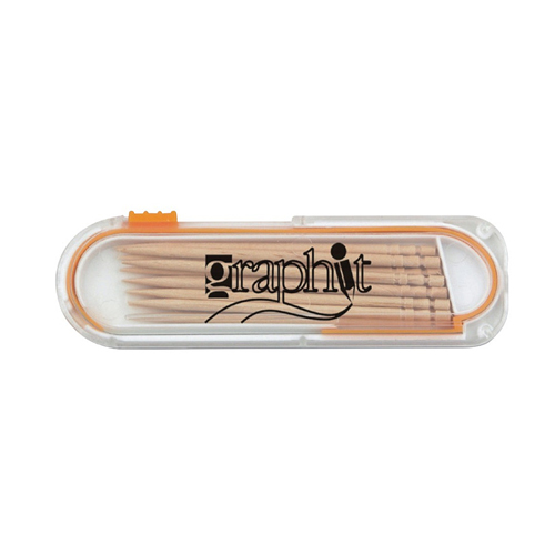 產品描述: 透明蓋子,白色底座,配桔色按鈕,含12枚牙簽,當妳滑動按鈕時牙簽會自動從盒子中伸出。